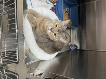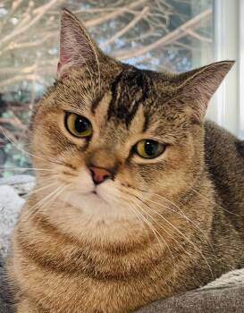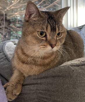 Marlo is clearly different from the typical domestic shorthair. She has a rounded face and a ticked tabby coat, assumingly...