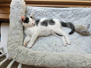 Meet Gizmo. This boy is a handsome cow kitty. He is quiet and sweet. He loves to play and explore...