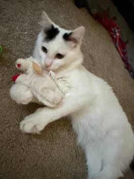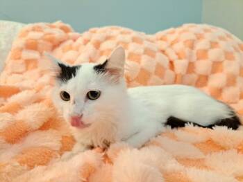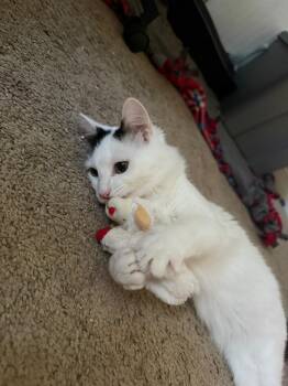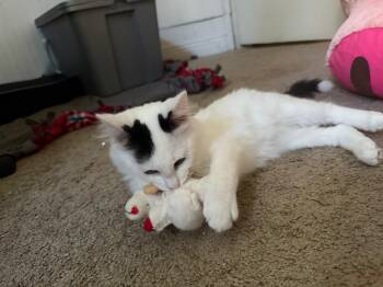 Biscuit is a sweet, fluffy kitten with a personality as warm as his soft white coat. With his striking black...