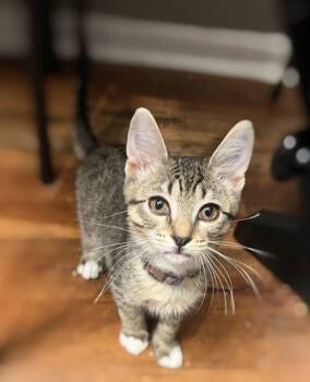 This kitten is the shiest out of the four, but is very easily pulled out of her shell when food...