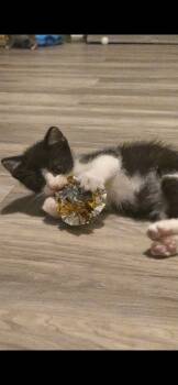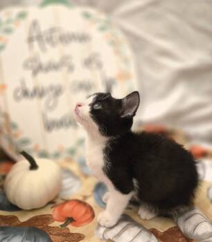 Meet Indy The Acrobat in a Tuxedo Indy is a medium-haired tuxedo kitten with mesmerizing grey-blue eyes and a personality...