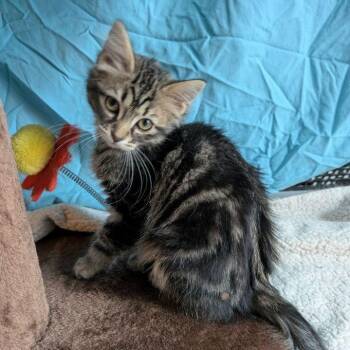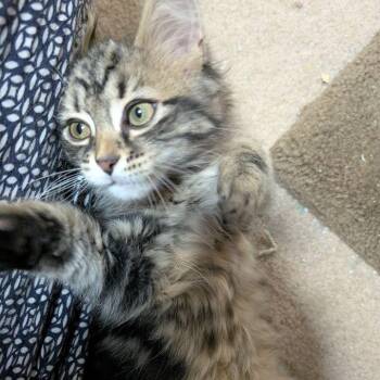 Durian is a handsome male brown marble tabby with fluffy, medium-length fur. Born at the end of July...