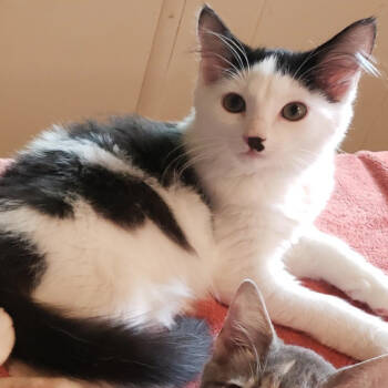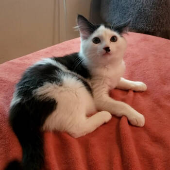 Fearless CHARLIE is a medium-haired white male teenager kitten with the cutest little black spots (sometimes called a "Cow Kitty"),...