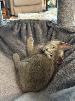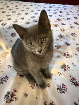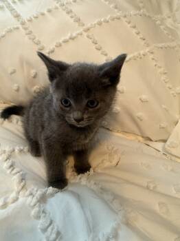 This adorable short-haired kitten has a soft, dark gray coat that's just a touch lighter on her sweet...