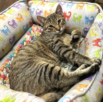 NUGGET is a brown tabby young adult kitty with dramatic stripes on his legs and tail. He is a charming,...