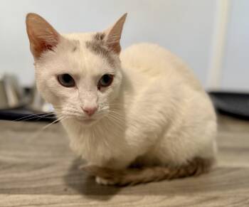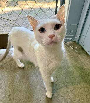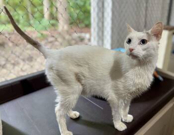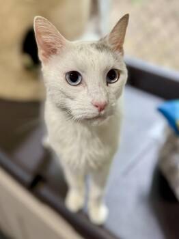 Stretch is a striking white and gray short-haired boy, born around 8/1/24, with piercing blue eyes and a...