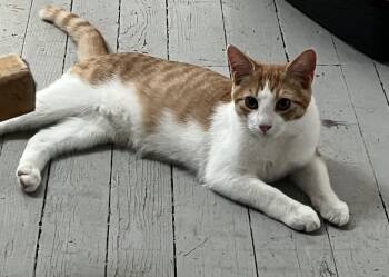 Frederick: Super-friendly orange-and-white cat who is very vocal! He loves to carry around his spring-toy ‘prey’, meows for equal attention...