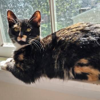 Meet Sarah, the elegant tortie with a heart of gold. This striking tortoiseshell-and-white beauty is still easing into life indoors...