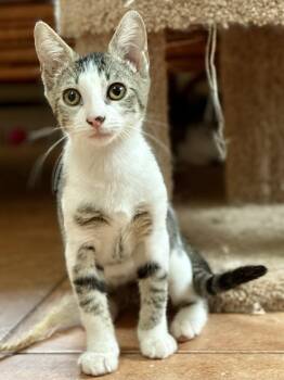 Meet Sparkle! A domestic short hair, grey and white tabby, who is approximately 10 weeks old. Her siblings are Freedom...