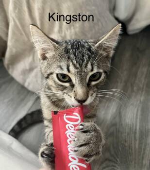 Kingston is a sweet kitten. He loves his foster cat friends and his humans. He loves his toys loves churu...