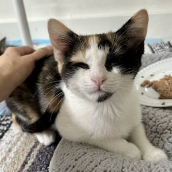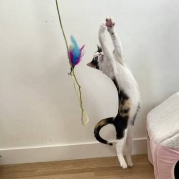 Mabel is a curious calico who loves exploring, chasing wand toys, and batting springs across the room. Playtime is her...