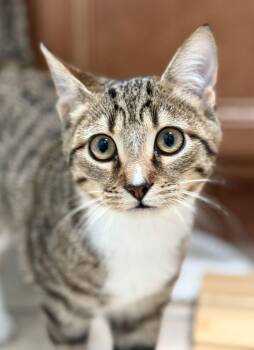 Hi! I’m Thrift and I’m the only boy of the group and I’m the biggest. I love my food, preferring wet food but I do eat dried food. I’m always getting into trouble by playing with my sisters and running and jumping over the furniture and my pen! I’m wild and very independent! I always prefers snuggling up to one of my siblings but love being picked up for a cuddle! I tolerated my fosters large German shepherd/husky mix down to eating the dog’s food before the dog can. I loved playing with my fosters other cats. I love my food and am litter trained.