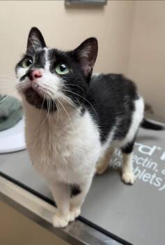Genesis is a stunning 1-year-old spayed female with striking black-and-white markings and bright green eyes — she even has a...