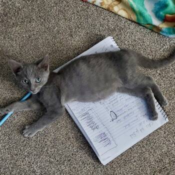 Hi, my name is Mouse. I am a 4-month-old, male, gray kitten. I'm little and cute, and I’m ready to...