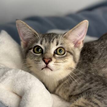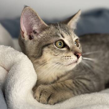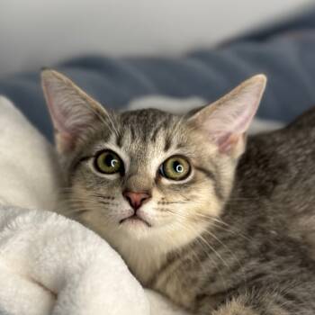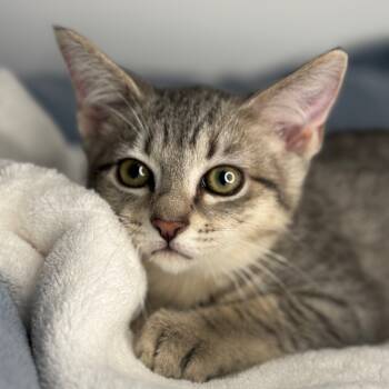 With her dazzling green eyes and soft tabby coat, this lovely gray gal is a quiet beauty. She may be...
