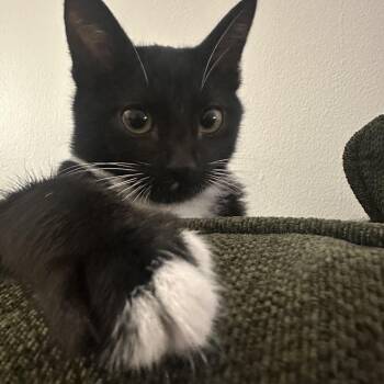 Moose (dark brown/black male) and Mouse (tuxedo female) are bonded kittens born in Aug 2025.