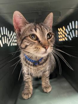 Kelpie is an 8-month-old grey tabby with a striking striped coat and...