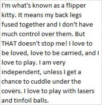 I'm what's known as a flipper kitty. It means my back legs don't work too well and I don't have...
