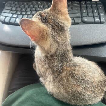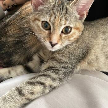 This 3-month-old torbie kitten is as sweet as she is beautiful. Robbins is a gentle, well-mannered, and playful little girl...