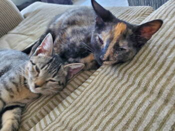 Beautiful tortoiseshell female kitten (dark, dramatic multi-coloring); she's affectionate, playful, friendly. She often snuggles up against her foster mom in...