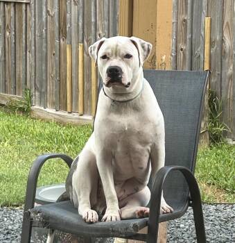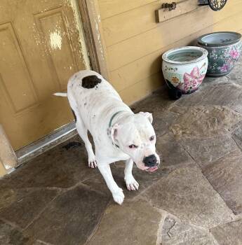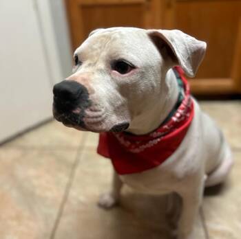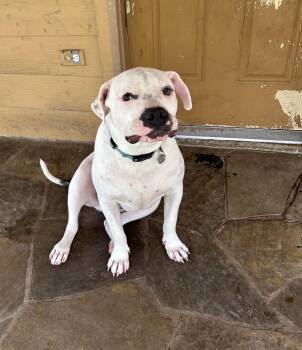 JC is a 65 lb American Bulldog mix with a striking white coat and...