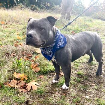 This sweet boy is a 4 year old American bully, weighing around 57 pounds.