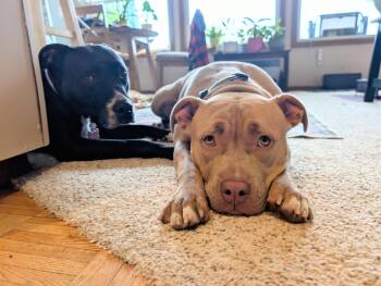 Say hi to Honey! She's a ~2-year-old American Bully and basically a 67-lb cartoon character in a velvet hippo suit....