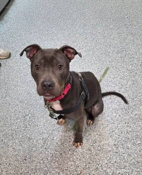 Meet Squeak, a 1 year-old American Staffordshire Terrier mix with a heart as big as her smile! This grey-and-white beauty...