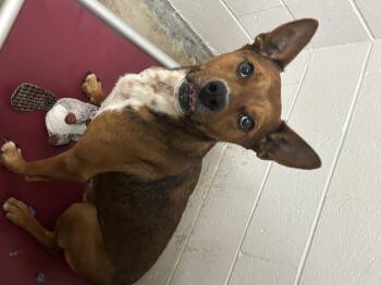 > Red is an energetic and playful 60 pound Heeler Shepherd mix