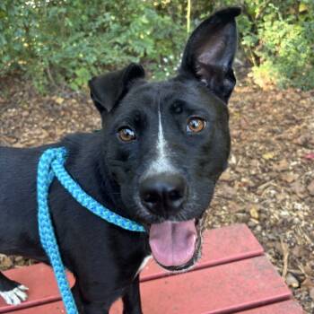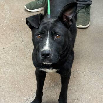 This gorgeous girl is a 47-pound, midsize black Retriever mix who's just a little over a year...