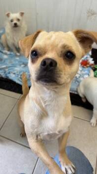 I’m a very sweet and gentle 1-year-old Puggle/Chihuahua mix with long, elegant legs and a beautiful tan...