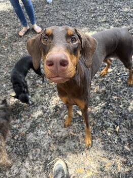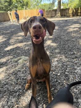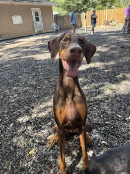 4 year old red Doberman Pincher. Starts off a little shy but quickly warms up. Dog and cat friendly. UTD...