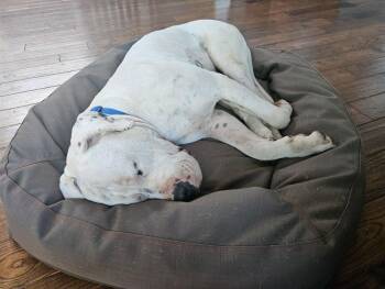 The Dogo Argentino is a large and muscular breed known for its strength, loyalty, and protective instincts. Originally bred in Argentina for big game hunting, this white coated dog is fearless, intelligent, and highly energetic. With proper training and socialization, the Dogo Argentino makes a devoted companion and family pet. While they can be wary of strangers, they are affectionate towards their owners and excel in various canine sports and activities.