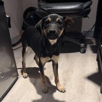 This 3-month-old pinscher mix was found in a garbage...