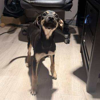 This 3-month-old pinscher mix was found in a garbage...