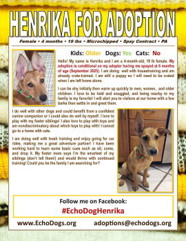 Female - 4 months - 19 lbs - Microchipped - Spay Contract - PAHello! My name is Henrika and I...