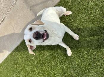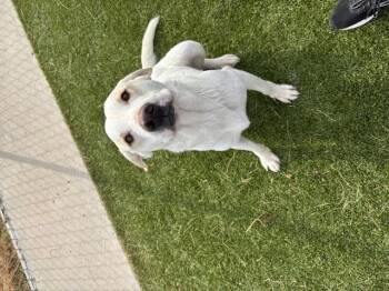 male, 1 year old, white and cream, Pyrenees/Lab mix, 59lbs