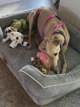 The Greyhound is a breed known for its speed and agility, originally bred for hunting and racing. These elegant dogs have a sleek, muscular build, known for their long legs and deep chests. Despite their athletic prowess, they are gentle and good natured, making them excellent family pets. Greyhounds are known for their calm demeanor and low maintenance grooming needs, with a loving and loyal nature that endears them to their owners.