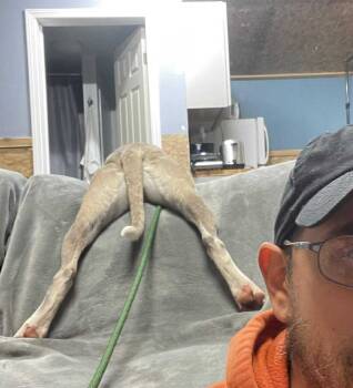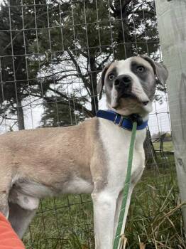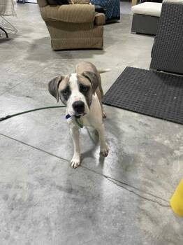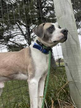 This handsome young pup with his mix of gray, tan, and white might be part Boxer, part hound,...