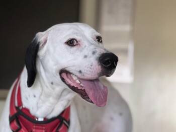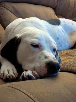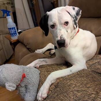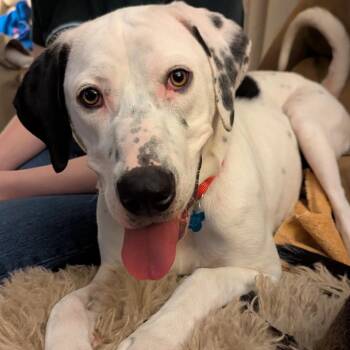 Meet Bubbles, a sweet and playful 1-year-old Lab/Great Dane/Hound mix with a stunning white coat and a heart as big...