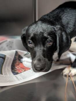 Meet Owen, a 5-month-old Lab mix with a glossy black coat and a crisp white chest, weighing 25 pounds of...