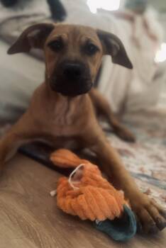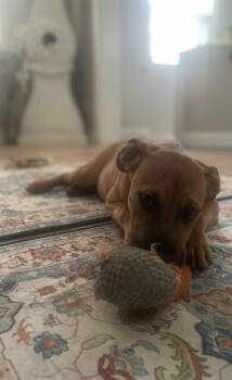 She loves her people, melts into cuddles, and proudly carries her squeak toy from room to room like...