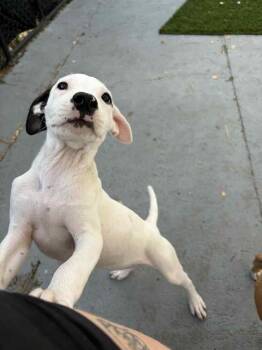 Buttons is jumping for joy and loving lifeespecially with his adorable one black ear! He's energetic, fun, and always ready...