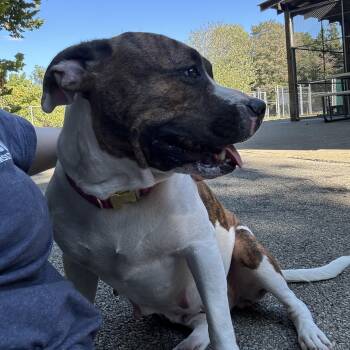 Hi there! I’m Audra — a soft-hearted, white-and-brindle sweetheart with a calm spirit and so much love to give.