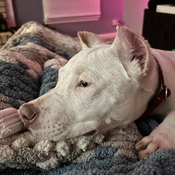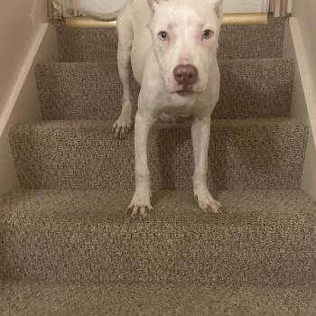 Meet Peeves, a 6-month-old pit mix puppy with a stunning all-white coat and the softest light green eyes! Peeves came...
