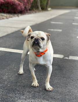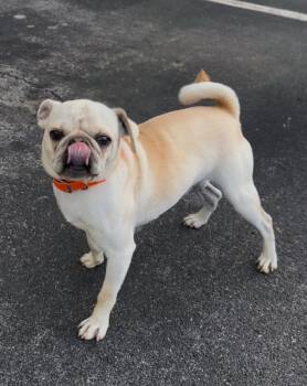 Schroeder is a fiesty little one-year-old cream-colored Pug. He's a little seventeen-pound ball of energy found walking on East Lamar...
