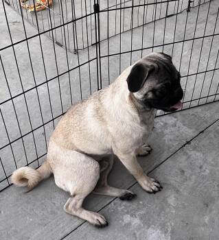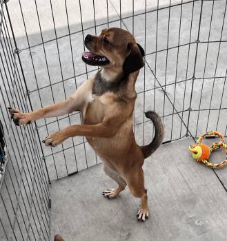 The puggle is a popular designer dog breed that is a cross between a pug and a beagle, resulting in a friendly and affectionate companion known for its playful nature and adorable appearance. Puggles typically have a short coat, expressive eyes, and a sturdy build. They are known for being sociable, energetic, and good with children, making them great family pets. Puggles require regular exercise and mental stimulation to keep them happy and healthy.