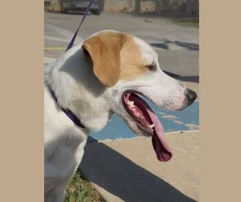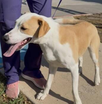 Buster is a 1.5-year-old retriever mix with a striking white-and-tan...