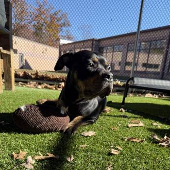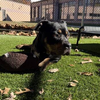 Who could say no to our tri-pod Rottie/Pittie Mix Rocco? This handsome boy is 2-years-old weighing in at 70 pounds...