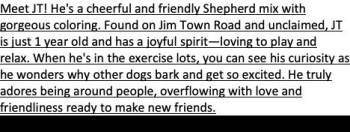 Meet JT! He's a cheerful and friendly Shepherd mix with gorgeous coloring. Found on Jim Town Road and unclaimed, JT...